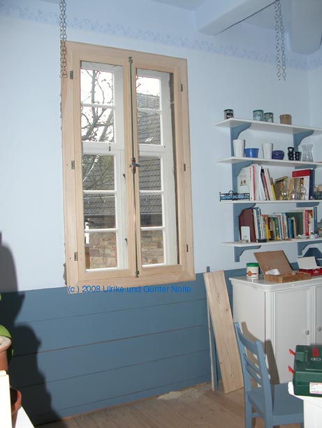 Meiner Meinung nach eine schönere Alternative ist auf dem angehängten Bild zu sehen. Die Vorsatzfenster stammen aus der Werkstatt von Andreas Milling. Das eingebaute 4 mm K-Glas bringt jetzt schon eine spürbare Verbesserung des Raumklimas und das, obwohl die Wandanschlüsse und Flügel bisher noch nicht vollständig abgedichtet wurden.