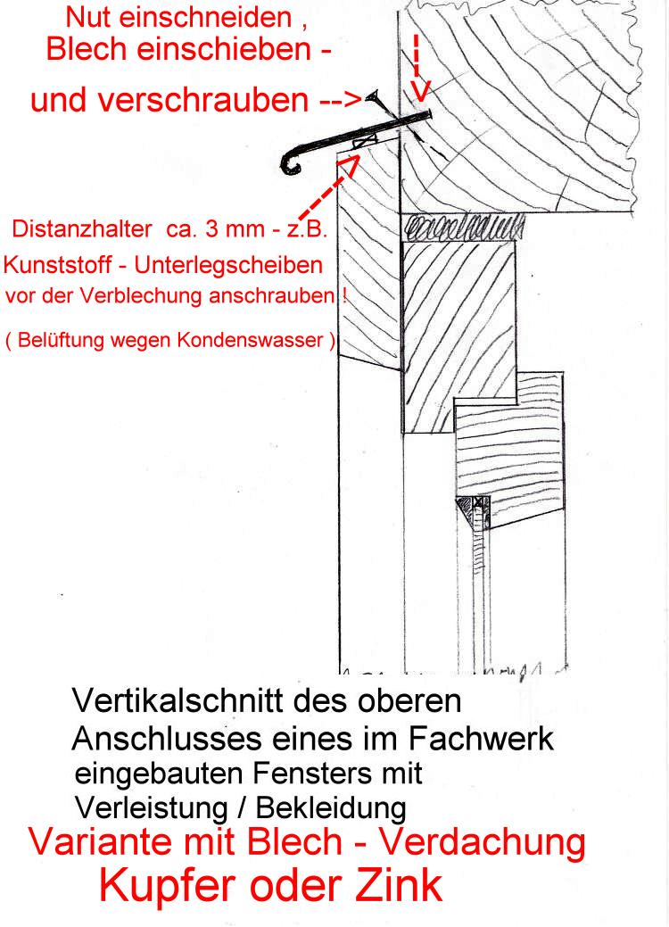 2. Das Einnuten von Hölzern, insbesondere aber von Blechen in das Fachwerkgefüge halte ich nicht nur für falsch, sondern fast schon für Sachbeschädigung. Mal davon abgesehen, das ich keinen historischen Kontext erkennen kann, aus dem herraus diese Art der Ausführung gerechtfertigt sein könnte, sind die bauphysikalischen Folgen doch wohl eher als sehr problematisch einzustufen. Un da wird man sich auch im 40. Lehrjahr mit den Fogen des eigenen Handelns auseinandersetzen müssen. Mal davon abgesehen, das Gerbsaüre und Kupfer oder Titanzink nun wirkliche keine guten Partner sind, hat gerade die eingeschlitzte Variante ein kapillare Wirkung, die nachhaltig nur zu Schäden führen kann.