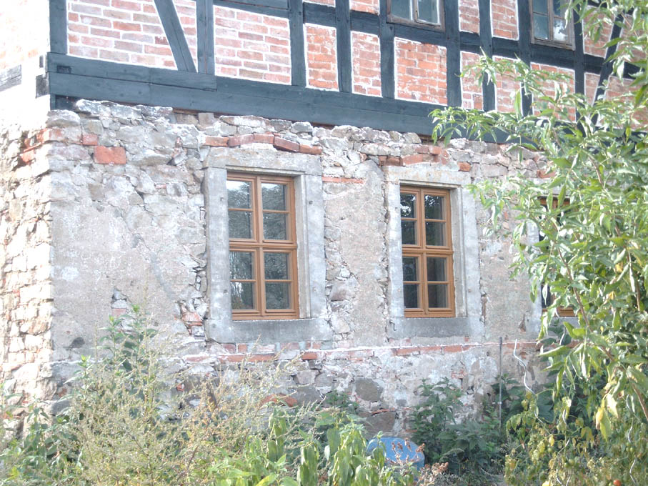 Kopfschmerzen bereitet mit die breite Verleistung der Fenster im Obergeschoss. Wie auf dem ersten Bild zu entnehmen ist, waren die vormaligen Fenster offensichtlich passgenau bündig eingebaut und kamen ohne die bauphysikalisch oft problematische Verleistung auf der Fuge aus.