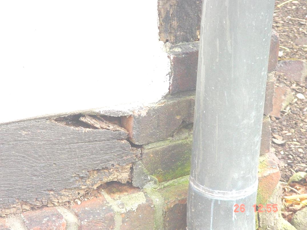 Die Schäden an den Eckstielen sind durch unzureichende Dachwasserableitung entstanden.