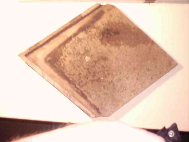 Ich stelle hierzu noch zwei weitere Bilder ein ? Einzelaufnahmen des Ziegels innen und außen. Leider sind die Farben hier nicht richtig wiedergegeben. Der Originalton ist ein beton-grau. Dieser Ziegel stammt aus einer Reparatur-Reserve, die ich auf dem Boden gefunden habe. Die Maße scheinen etwas abweichend (größer) von den Maßen der vorhandenen Eindeckung zu sein. Wahrscheinlich wurden deshalb auch die seitlichen Spitzen etwas gebrochen, um sie in der Breite richtig einpassen zu können. Die Winkel sind aber identisch. Ein weiterer Unterschied ist das ?Markenzeichen H.M.B.?, das sich bei Ziegeln der vorhandenen Eindeckung (noch) nicht findet.