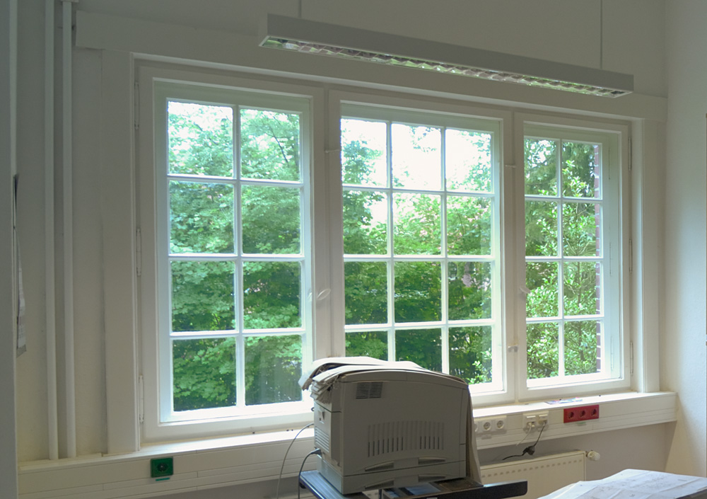 Hier sind sowohl die originalen Kastenfenster zu sehen, mit Sprossen in den äußeren Flügeln, als auch in den 60er Jahren "modernisierte" Fenster, bei denen die Sprossen herausgerissen worden sind. Die Löcher sind jetzt mit Kitt zugespachtelt und übergestrichen.