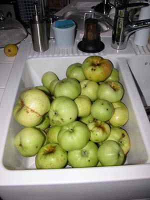 Der Apfelbaum wird von der Tochter der Vorbesitzerin als "Weiße Klara" bezeichnet. Leider finde ich unter dieser Bezeichnung nichts in meinen Büchern über alte Apfelsorten und auch nicht im Internet. Es ist wohl ein Klarapfel, wenn auch kein früher. Lagern kann man ihn nicht. Geschmacklich ist er ein Traum (frisch-säuerlich), mengenmäßig dieses Jahr aber eher eine Enttäuschung. Wenn man dann noch den starken Wurmbefall (gilt für all unsere Bäume) berücksichtigt - da blieb nicht sehr viel übrig. 4 Gläser Apfelmus und 10 Flaschen Saft sind die Ausbeute, für die etwa 1 Tag Arbeitszeit "draufging".
